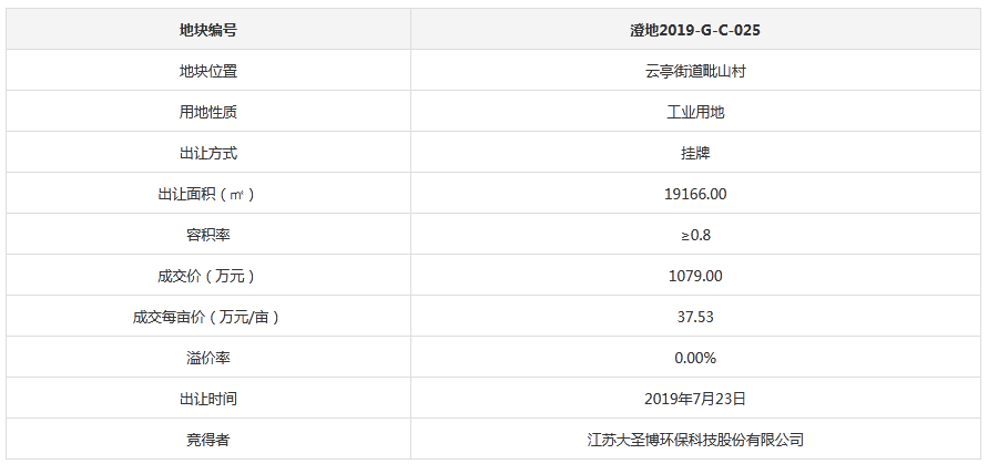 編號(hào)為澄地2019-G-C-025地塊,位于云亭街道毗山村,工業(yè)用地,出讓年限 50年,出讓總用地面積為19166.00㎡,建設(shè)用地面積19166.00㎡,容積率≥0.8,起始價(jià)1079.00萬(wàn)元,最終由江蘇大圣博環(huán)??萍脊煞萦邢薰疽缘變r(jià)1079.00萬(wàn)元(37.53萬(wàn)元/畝)成交。